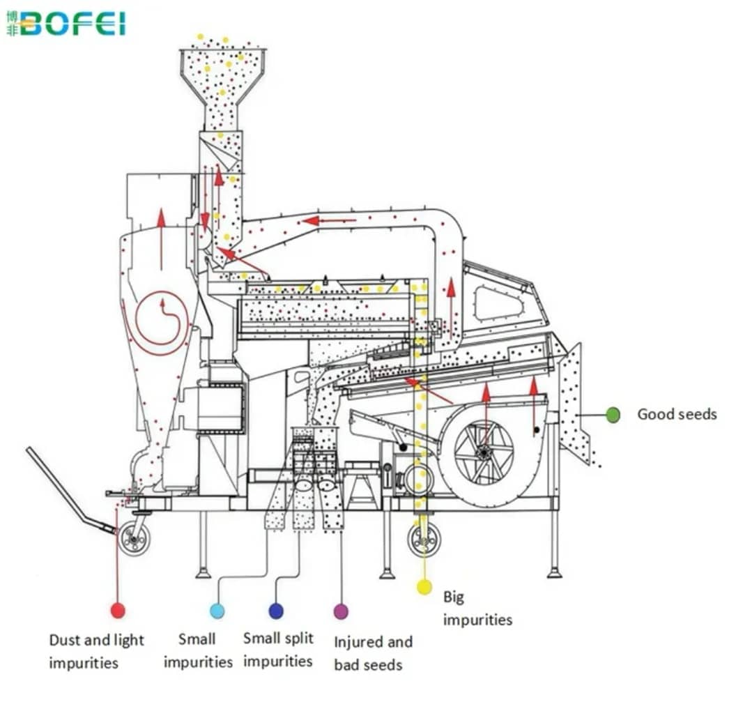 يتم تغذية المنتج بشكل متوازن عبر أسطوانة إدخال الماكينة ثم يُنقل إلى وحدة التنظيف الأولي بواسطة نظام الرافعة (الإليفيتور). في مرحلة التنظيف الأولي يتم فصل الشوائب الخشنة، بينما يقوم نظام الشفط بإزالة الجزيئات الخفيفة. بعد ذلك يتم إجراء التنظيف الحجمي عبر غرابيل دقيقة، ثم يُنقل المنتج إلى وحدة طاولة الجاذبية حيث يتم الفصل النهائي للجودة اعتمادًا على فروقات الوزن النوعي.